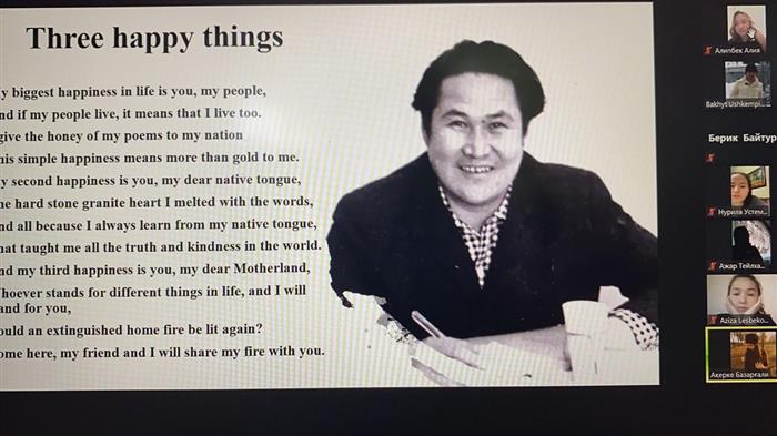 Қазақтың ұлы ақыны Мұқағали Мақатаевтың туғанына осы жылы 90 жыл (1931-1976), Осыған орай 27 сәуірде Үшкемпіров Б.М., Шет тілдер кафедрасының оқытушысы және «Қоғамдық денсаулық сақтау» мамандығының 1 курс студенттерімен іс- шара өткізілді. Кездесу барысында студенттер М.Мақатаев шығармашылығымен жақынырақ танысып, қазақ поэзиясының алтын қоры екенін білді. ХХ ғасырдың бірінші жартысында дүниеге келген, ұлттық бастауларды рух пен тәнге сіңірген талант өз халқының ең сүйікті ақыны болды. Студенттер ақынның шығармашылығын бір-біріне оқып беріп жақсы уақыт өткізді. Мұқағали – халқын, ана тілін, Отанын қадыр тұтқан азамат ақын. Ол «Үш бақытым» атты өлеңінде кейінгі жас буынды халқын, тілін, туған жерін шексіз сүюге шақырады. Іс-шаранын соңында 1 курс студенті Базарғали Ақеркенің орындауында “Үш бақытым (three happy things)” өлеңімен аяқтадық