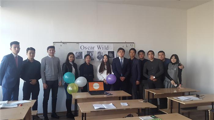 Біз, 2017 жылдың 22-ші қараша күні, сағат 11.00 – 12.00 аралығында әл-Фараби атындағы Қазақ ұлттық университеті, заң факультетінің 5В030100 – «Құқықтану» мамандығы бойынша оқитын 1 курс, 101, 102 топтар, (Intermediate level), қазақ бөлімі студенттерімен бірігіп университетімізде аталып өтіп жатқан «100 - Кітап» жобасының аясында «Oscar Wilde!» тақырыбына ағылшын тілінде тәрбиелік іс-шара өткіздік. Тәрбиелік іс-шараға топтағы барлық студенттер (12 студент) белсене қатысты. Тәрбиелік іс-шара барысында берілген тақырып бойынша топ студенттері аудиторияны шарлармен, тақырып атауы жазылған лозунгпен, жазушының суреттерімен безендірді. Тәрбиелік іс-шараны топ старостасы Төлеген Аяжан жүргізді, ал атақты жазушы Оскар Уайлдтың өмірбаяны бойынша топ студенттері Сағатов Арсен, Асқарбекұлы Әлишер, Даутов Ансар, Төре Даурен баяндама жасады, жазушы туралы әртүрлі қызықты мәліметтерді студент Болатұлы Бекболат оқып берді және де оның жазып қалдырған шығармаларын қысқаша түрде топ студенттері Куанжанова Куралай және Нұрғалым Малика талқылады. Сонымен қатар қалған топ студенттері жазушының ағылшын тілінде жазылған қанатты сөздерін мысалға келтіріп, олардың мән-мағынасын түсіндірді және де оларды қазақ тіліне аударды. Жүргізуші Төлеген Аяжан мен топ студенті Кахарман Алмас екеуі бірге жазушы туралы толық мәлімет беретін презентация жасап, дайындаған материалдарын топтағы басқа студенттерге айтып берді. Сонымен қатар, студенттер жазушы Оскар Уайлд туралы бір-біріне көптеген сұрақтар қойып, оларға жауап берді. Барлық студенттер тәрбиелік іс-шараға белсене қатысты. |