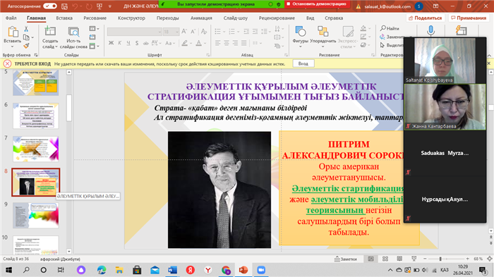 2021 жылдың 26 сәуір күні Философия және саясаттану факультеті, Дінтану және мәдениеттану кафедрасының аға оқытушысы Ж.У. Кантарбаева және «Конфликтологиядағы діни бірегейлік» мамандығының 1 курс магистранты С.С.Қойшыбаеваның ұйымдастыруымен педагогикалық практика аясында «Дінтану» мамандығының 2 курс студенттерімен ZOOM платформасында «Дін және әлеуметтік стратификация» тақырыбында ашық сабақ өткізілді.