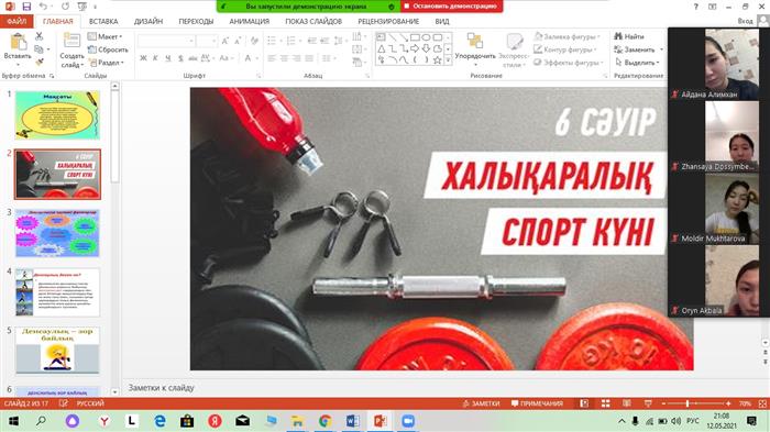 2021ж. 6-сәуір Халықаралық спорт күніне орай «Тәні саудың жаны сау» жобасын бойынша тәрбиелік сағат «Мәдениеттану» мамандығының 2 курс студенттері куратор-эдвайзері М.А.Есболовамен онлайн Zoom платформасында орындалды
