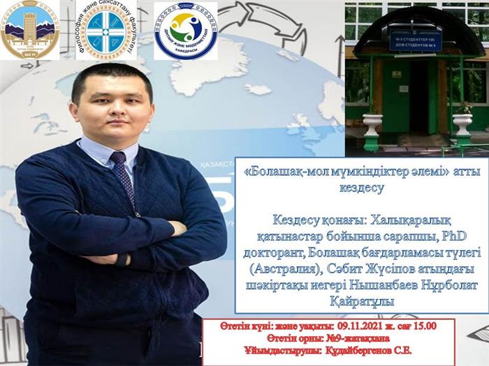 9-қараша күні №9 жатақханада Әл-Фараби атындағы Қазақ ұлттық университеті философия және саясаттану факультетінің дінтану және мәдениеттану кафедрасының оқытушысы, куратор-эдвайзер Серғазы Құдайбергеновтың ұйымдастыруымен «Болашақ-мол мүмкіндіктер әлемі» атты кездесу өтті. Кездесу қонағы: Халықаралық қатынастар бойынша сарапшы, PhD докторант, Болашақ бағдарламасы түлегі (Австралия), Сәбит Жүсіпов атындағы шәкіртақы иегері Нышанбаев Нұрболат Қайратұлы
