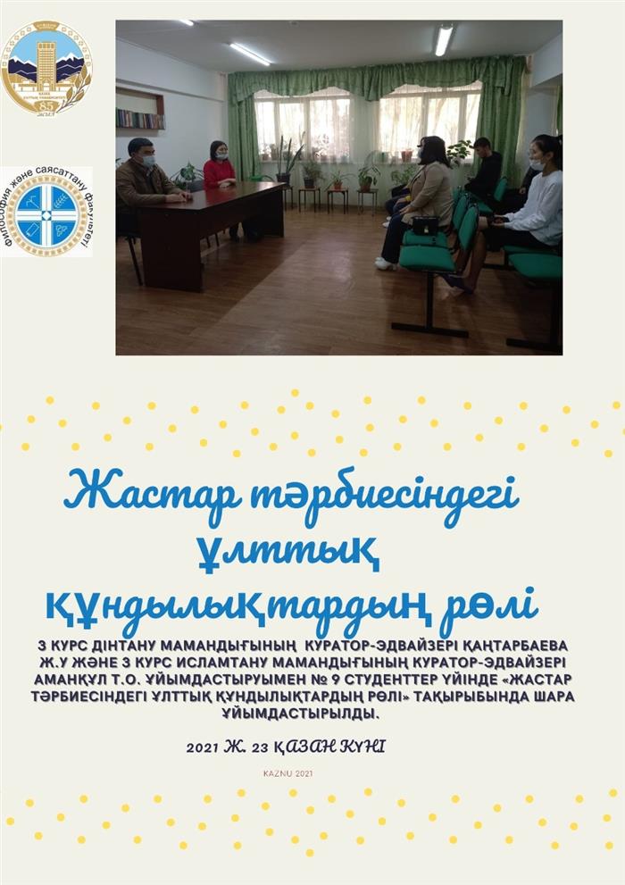2021 ж. 23 қазан күні философия және саясаттану факультеті дінтану және мәдениеттану кафедрасы 3 курс дінтану мамандығының куратор-эдвайзері Қаңтарбаева Ж.У және 3 курс исламтану мамандығының куратор-эдвайзері Аманқұл Т.О. ұйымдастыруымен № 9 студенттер үйінде «Жастар тәрбиесіндегі ұлттық құндылықтардың рөлі» тақырыбында іс-шара ұйымдастырылды. Аталмыш іс-шара барысында, студенттермен заманауи қоғамдағы ұлттық құндылықтардың маңыздылығы талқыланып, викторина ұйымдастырылды. Студенттер қызу пікірталасқа қатысып, өз ойларымен бөлісті. Іс-шара өте қызықты өтті.