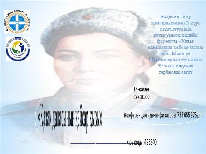 22 қазан күні философия және саясаттану факультеті дінтану және мәдениеттану кафедрасының оқытушысы Серғазы Құдайбергеновтың ұйымдастыруымен мәдениеттану мамандығының 2-курс студенттерінің қатысуымен онлайн форматта «Қазақ даласының қайсар қызы» атты Мәншүк Мәметованың туғанына 99 жыл толуына тәрбиелік сағат өтті. Тәрбие сағатының мақсаты- студенттерді отан сүйгіштікке, ерлікке, адалдыққа баулу, патриоттық сезімін қалыптастыру болып табылады.