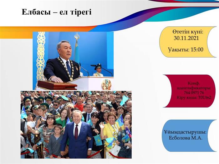 30-қараша күні философия және саясаттану факультеті дінтану және мәдениеттану кафедрасының аға - оқытушысы Молдир Есболованың ұйымдастыруымен мәдениеттану мамандығының 3-курс студенттерінің қатысуымен онлайн форматта «Елбасы –ел тірегі» атты ҚР Тұңғыш Президенті күніне арналған тәрбиелік сағат өтті. Іс-шара барысында Нұрсұлтан Әбішұлы Назарбаевтың өмір жолымен, туып өскен жерімен, оқып білім алған орнымен, қызмет еткен жерлері туралы мағлұмат берілді. Елбасындай Отанын, халқын сүюге, нағыз азамат, шынайы патриот болуға тәрбиелей отыра студенттердің бойында Елбасына деген сүйіспеншілік, құрмет сезімін қалыптастыру жайлы мәселе қозғалды.