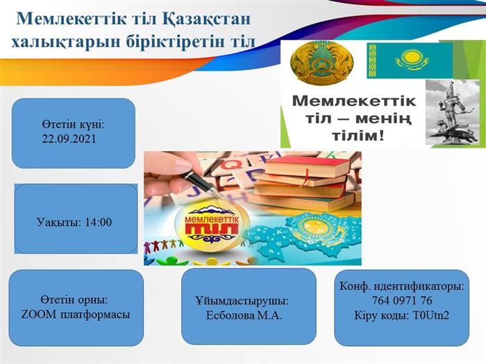 22-қыркүйек күні философия және саясаттану факультеті дінтану және мәдениеттану кафедрасының аға - оқытушысы Молдир Есболованың ұйымдастыруымен мәдениеттану мамандығының 3-курс студенттерінің қатысуымен онлайн форматта Қазақстан Республикасының халықтарының тілдер күніне орай "Мемлекеттік тіл Қазақстан халықтарын біріктіретін тіл" атты танымдық сағат өтті. Іс-шара барысында тұлғаның жалпыадамзаттық және ұлттық құндылықтарға бағдарлануына, ана тілі мен қазақ халқының, Қазақстан Республикасында тұратын этностар мен этникалық топтардың мәдениетін құрметтеуіне ықпал ету жайлы сөз қозғалды.