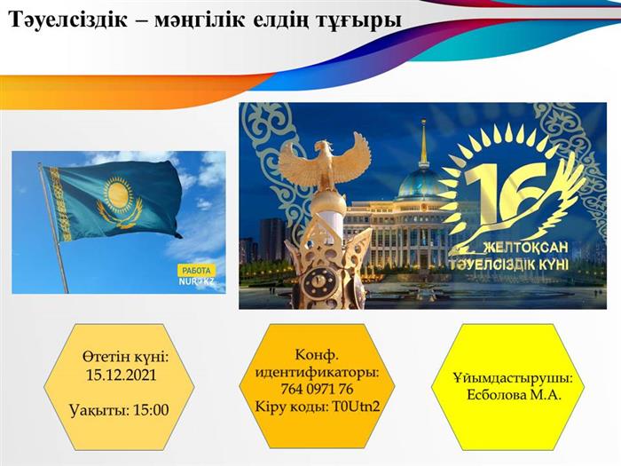 15-желтоқсан күні философия және саясаттану факультеті дінтану және мәдениеттану кафедрасының аға - оқытушысы Молдир Есболованың ұйымдастыруымен мәдениеттану мамандығының 3-курс студенттерінің қатысуымен онлайн форматта «Тәуелсіздік – мәңгілік елдің тұғыры» атты Қазақстан Республикасының тәуелсіздігінің 30 жылдығына арналған тәрбиелік сағат өтті. Іс-шара барысында Еліміздің тәуелсіздік алу жолындағы ата-бабаларымыздың ерлігін паш ету, студенттермен желтоқсан құрбандарымен, желтоқсан оқиғасына қатысқан аға-апалардың ерлігін талқылап, туған өлкемізге деген сүйіспеншілігі мен сезімдері туралы сөз қозғалды.