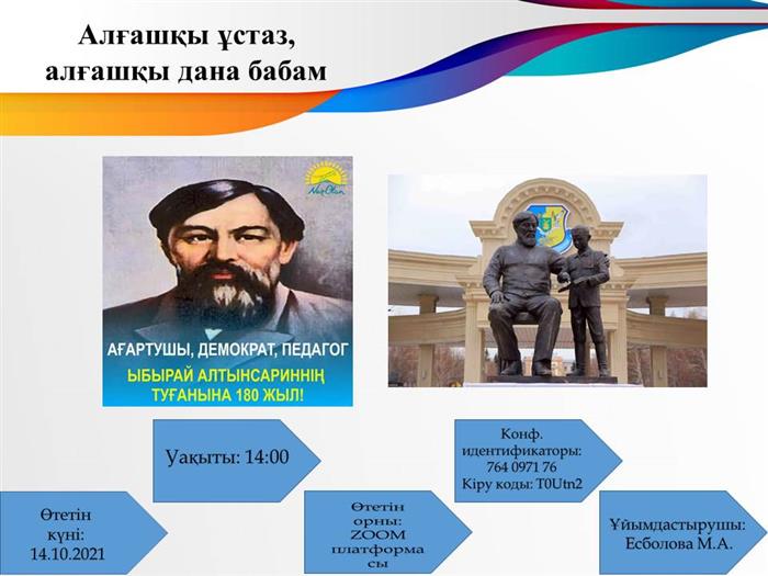 14-қазан күні философия және саясаттану факультеті дінтану және мәдениеттану кафедрасының аға - оқытушысы Молдир Есболованың ұйымдастыруымен мәдениеттану мамандығының 3-курс студенттерінің қатысуымен онлайн форматта алғашқы ұстаз, ұлы ағартушы, педагог, қоғам қайраткері Ыбырай Алтынсариннің 180 жылдығы арналған «Алғашқы ұстаз, алғашқы дана бабам» атты тәрбиелік сағат өтті. Іс-шара барысында бүкіл адамзат баласы бас иер асыл тұлға ұстаздардың ерен еңбегін, мол қадірін, тарихтағы баға жетпес орнын паш етуге, жас ұрпақты ұстазды құрметтеуге, адамгершілікке, сыйлап түсіне білуге үйрету, ұстаз мамандығының қыры мен сырын түсіндіру, ұстаз еңбегін әрқашанда бағалай білу жайлы айтылды.