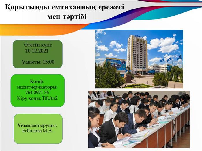 10-желтоқсан күні философия және саясаттану факультеті дінтану және мәдениеттану кафедрасының аға - оқытушысы Молдир Есболованың ұйымдастыруымен мәдениеттану мамандығының 3-курс студенттерінің қатысуымен онлайн форматта «Қорытынды емтиханның ережесі мен тәртібі» атты кураторлық сағат өткізілді. Іс-шара барысында студенттерге емтихан ережелері мен өткізілу тәртіптері туралы мағлұмат берілді.