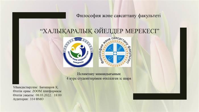 8 наурыз күні «Айналаңды нұрландыр» жобасы аясында Философия және саясаттану факультеті Дінтану және мәдениеттану кафедрасы, 4 курс исламтанушы студенттердің қатысуымен «8 наурыз - Халықаралық әйелдер мерекесі» тақырыбында лекция оқылды.