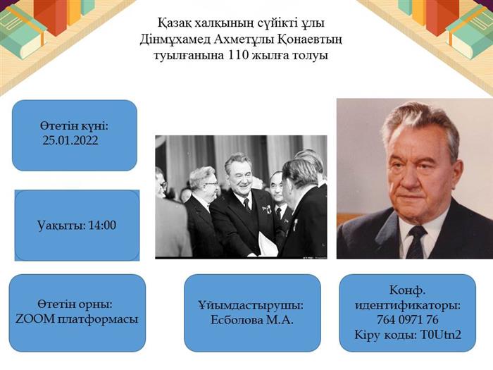 25-қаңтар күні философия және саясаттану факультеті дінтану және мәдениеттану кафедрасының аға - оқытушысы Молдир Есболованың ұйымдастыруымен мәдениеттану мамандығының 3-курс студенттерінің қатысуымен онлайн форматта Қазақ халқының сүйікті ұлы Дінмұхамед Ахметұлы Қонаевтың туылғанына 110 жыл толуына арналған тәрбиелік сағат өткізілді. Іс-шара барысында ұлы тұлғаның өміржолы мен істері талқыланды.