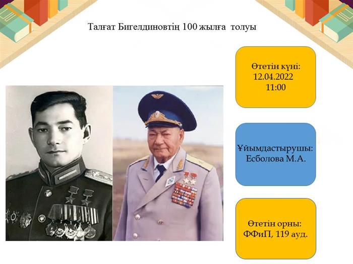 12-cәуір күні философия және саясаттану факультеті дінтану және мәдениеттану кафедрасының аға - оқытушысы Молдир Есболованың ұйымдастыруымен мәдениеттану мамандығының 3-курс студенттерінің қатысуымен оффлайн форматта Кеңес Одағының екі мәрте батыры, Қазақстан авиациясының генерал-майоры Талғат Бигелдиновтің 100 жыл толуына орай тәрбиелік сағат өткізілді. Іс-шара барысында ұлы тұлғаның өміржолы мен істері талқыланды.