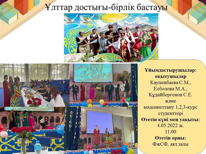 4-мамыр күні философия және саясаттану факультеті дінтану және мәдениеттану кафедрасының оқытушылары Каупенбаева С.М., Есболова М.А., Құдайбергенов С.Е. және мәдениеттану мамандығының 1,2,3-курс студенттерінің ұйымдастыруымен өткен «1-мамыр – Қазақстан халықтарының бірлігі күні» мерекесіне орай «Ұлттар достығы-бірлік бастауы» атты факультет деңгейінде іс-шара өткізді. Іс-шара барысында әр кафедрадан іріктеліп алынған студенттер еліміздегі ұлт өкілдерінің мәдениеті мен салт-дәстүрлерін таныстырумен қатар, өз өнерлерін көрсетті. Білім алушылар ішінен үздіктері марапатқа ие болды.