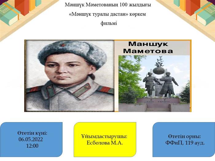 6-мамыр күні философия және саясаттану факультеті дінтану және мәдениеттану кафедрасының аға - оқытушысы Молдир Есболованың ұйымдастыруымен мәдениеттану мамандығының 3-курс студенттерінің қатысуымен оффлайн форматта майданда есімі асқақтаған батыр қыз Мәншүк Мәметованың 100 жылдығы «Мәншүк туралы дастан» көркем фильмін тамашалау тәрбиелік іс -шарасы өткізілді. Іс-шара барысында ұлы тұлғаның өміржолы мен істері талқыланды.
