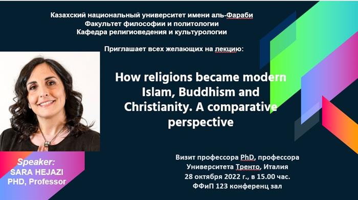 2022 жылдың 28 қазан күні визит профессор PhD доктор, Тренто университетінің (Италия) қауымдастырылған профессоры Сара Хеджази философия және саясаттану факультетінің дінтану және мәдениеттану кафедрасының студенттері, магистранттары мен докторанттарына «How religions became modern» тақырыбында дәріс өткізді.