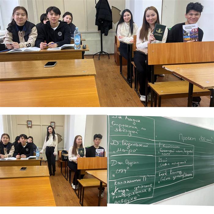 2023 жылдың 2 наурызда сабақ кестесі бойынша сағат 12:25-те «ҚазҰУ бейіндік мектебінің» 9б ФМ-1 оқушыларына дінтану және мәдениеттану кафедрасы, «6B03102-мәдениеттану» білім беру бағдарламасының 4-курс студенттері Алимхан Айдана мен Садуақас педагогикалық практика бойынша «100 кітап» атты инновациялық жобасы аясында оқушылармен сүйікті кітаптарын талқыға салды. Дінтану және мәдениеттану кафедрасының аға оқытушылары, ғылыми жетекшілері Жаркимбаева Дана Бактубаевна және Каупенбаева Самал Мухаметалиевна бағыт-бағдар беру мақсатында қатысты.