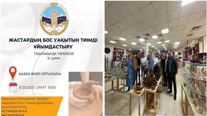 31-наурыз күні «8D03102-мәдениеттану» мамандығының докторанттары Исламбеков А.Б. және Магзумов М.М. қатысуымен дінтану және мәдениеттану кафедрасының аға оқытушылары филос.ғ.к. Аликбаева М.Б., Мұханбет А.А. жетекшілігімен Тұрақты даму мақсатының 3-бағыты бойынша ұйымдастырылған іс-шаралары аясында Тарих факультеті Тарих мамандығының 1-курс студенттерімен Қазақ қолөнер орталығына барып «Жастардың бос уақытын тиімді ұйымдастыру" тақырыбында тәрбиелік іс-шара ұйымдастырды. Іс-шарада қазақтың ұмыт бола бастаған қолөнерін насихаттау мақсатында қызықты ақпараттар алып, қолөнер мәдениеті тарихымен танысып, шебер Бабашов Даниярдың нұсқаулығымен қолдан құмыра жасап, шеберліктерін шыңдады. Студенттердің шеберлік сағатынан алған әсерлері өте жоғары болды.