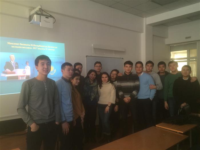 27.02.2017 жылы «Айналанды нұрландыр» жобасы аясында «Елбасының Қазақстан халқына жолдауын» талқылауға арналған дискуссиялық алаң өткізілді. Студенттер Елбасының ұсынған бағдарламаларын жалынды талқылап, өз пікірлерін білдірді.