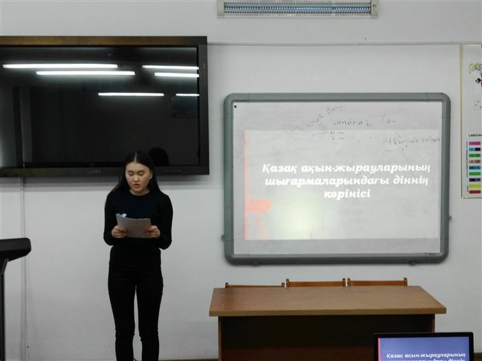 28 қараша күні сағат 16.00 де, 302 аудиторияда «Айналаңды нұрландыр» жобасы аясында, дінтану және мәдениеттану кафедрасының аға-оқытушысы Мұқан Нұрзат және филология және әлем тілдері факультетінің, қазақ тілі және әдебиеті мамандығының 2 курс студенттерінің ұйымдастыруымен «Қазақ ақын жазушыларының шығармаларындағы діннің көрінісі» тақырыбында ашық тәрбие сағаты өтті.