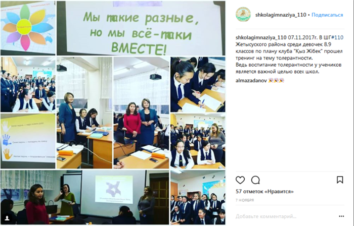 2017 жылдың 7 қарашада №110 мектеп-гимназияда «Бір шаңырақ астында» атты Халықаралық төзімділік күніне байланысты іс-шара өткізіледі.