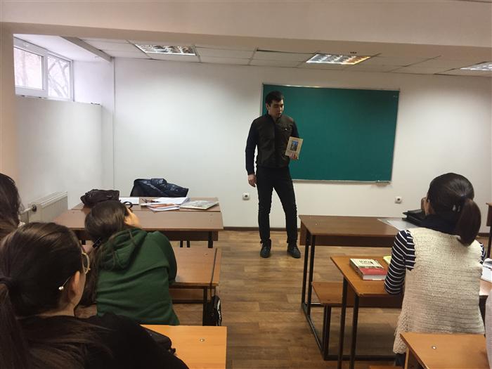 14 желтоқсанда «Саясаттану» мамандығының 1 курс магистранты Сейтханов Нурбек өзінің оқып жүрген «Organization and planning of scientific research» пәні бойынша тобындағы магистранттарға З.А. Мансуровтың «Оралмандарға білім беру: КазҰУ-дың тәжірибесі және басымдығы» атты кітабімен таныстырды. Презентация барысында барлық студенттер кітапты талқылап, қысқаша рецензия айтып, белсенді қатысты.
