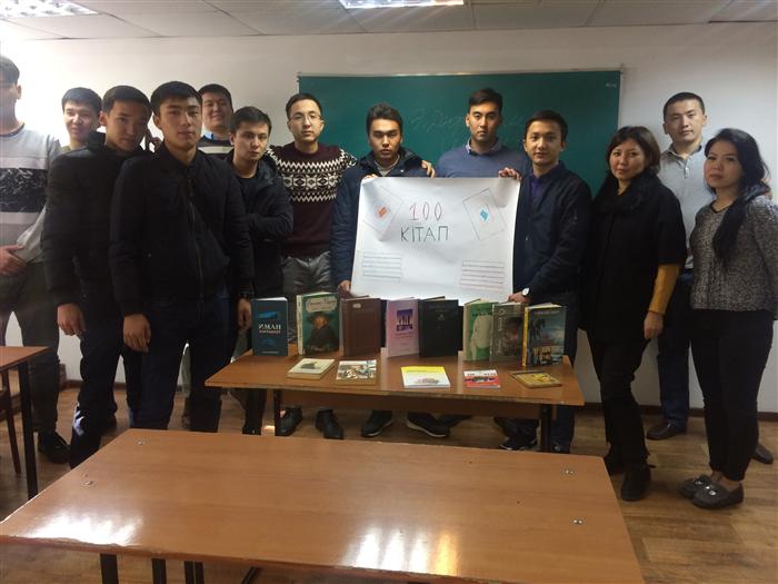 06.11.2017 күні сағат 11:00 де Қаңтарбаева Жанна Уринбасаровнаның ұйымдастыруымен «100 Кітап» жобасы аясында «Кітап алмасу» акциясы өткізілді. Акция барысында студенттер оқыған әдеби туындыларды басқа кітапқа ауыстыруға мүмкіндік алды. Шараның мақсаты – студенттердің көркем әдебиеттерді оқуға деген қызығушылығын арттыру болды. Студенттер отандық және шет елдік әдеби туындыларға деген өз қызуғушылықтарын байқатты.