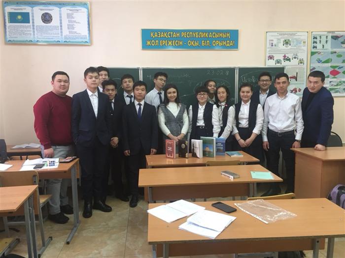 Педагогикалық практика аясында, Дінтану 4 курс студенттері Сейдахметов Б., Орал А., Жанатов А., Кенесбай Ә. №163 мектеп-лицейінде «100 кітап» жобасы бойынша іс-шара өткізді.
