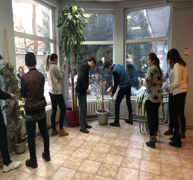 «Green Compus» жобасы аясында Алматы Медицина Колледжінде «Мәдениеттану» мамандығының 4 курс студенті Нұртаза Б.Б. 1 курс «Фельдшер» мамандығы студенттерімен бірге 1 қабаттағы холл гүлдерін суару, тазалау жұмыстарын жүргізді.
