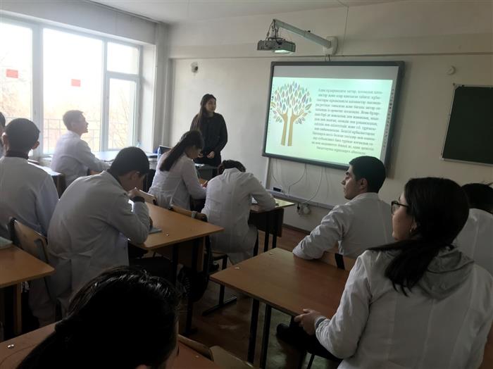 Педагогикалық тәжірибе барысында, 2019 жылдың 13 ақпанында сағат 8-00 де «Айналаңды нұрландыр» жобасы аясында Жоғарғы Медициналық колледжінің «Емдеу ісі» мамандығының (1813 топ) 1 курс студенттерімен «Заманауи мәдени адамның құндылықтары» тақырыбында дөңгелек үстел өтті. Іс-шара барысында заманауи мәдени адамның құндылықтарын анықтадық.