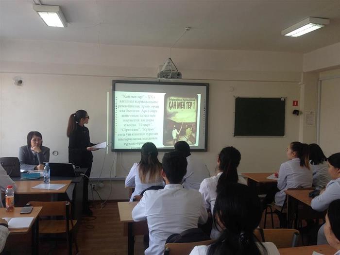 Педагогикалық практика барысында 2019 жылдың 11 ақпанында сағат 15:15 -те «100 кітап» жобасы аясында Жоғарғы Медициналық колледжінің «Мейіргер ісі» мамандығының (1702 топ) 2 курс студенттерімен Ә. Нұпейісовтың «Қан мен тер» атты кітабына талқылау өтті. Іс-шара барысында студенттер кітаптың идеясы туралы өз ойларын айтты.