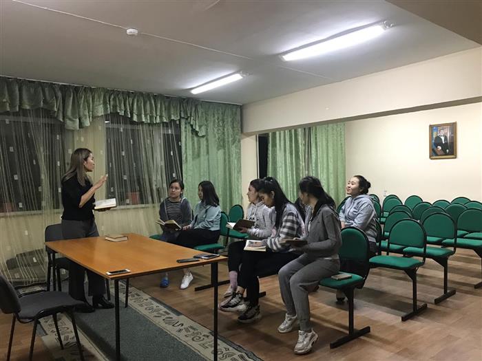 2019 жылдың 26 наурыз күні дінтану және мәдениеттану кафедрасының аға оқытушысы Әлтаева Н.С. және 3 курс дінтану мамандығының студенттерімен «100 кітап» жобасы аясында әл Фарабидің «Қайырымды қала тұрғындары» еңбегін оқып талдады.