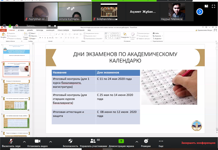 2020 жылдың 30 сәуір күні әл-Фараби атындағы ҚазҰУ, философия және саясаттану факультеті, дінтану және мәдениеттану кафедрасының меңгерушісі, профессор А.Д. Құрманалиева және оқытушылық-профессорлық құрам кафедра студенттері, магистранттарымен зум платформасында онлайн режимде кездесу өткізді. Кездесу барысында білім алушыларға алдағы жазғы сессия, қашықтықтан тапсырылатын қорытынды емтихан түрлері мен оның ережелері, шарттары туралы ақпараттар беріліп, білім алушылар тарапынан қойылған бірқатар сұрақтарға жауаптар берілді.
