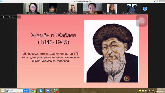 ZOOM платформасында Дінтану мамандығының 2 курс студенттерімен, куратор-эдвайзер Ж.У. Қаңтарбаеваның жетекшілігімен "Жамбыл Жабаевтың 175 жылдығы" тақырыбына кураторлық сағат өткізілді