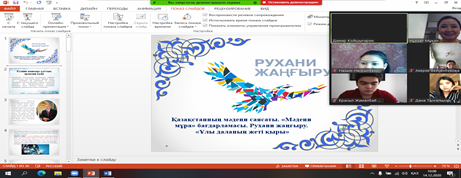 «Айналаңды нұрлаңдыр» жобасы аясында 2020 жылы 14 желтоқсанда сағат 10:00-де Zoom платфоомасында. Тарих және археология, этнология факультетінің 1 курс студенттерімен аға оқытушы Мұқан Нұрзаттың ұйымдастыруында "Рухани жаңғыру" тақырыпы аясында тәрбиелік сағат өткізілді.