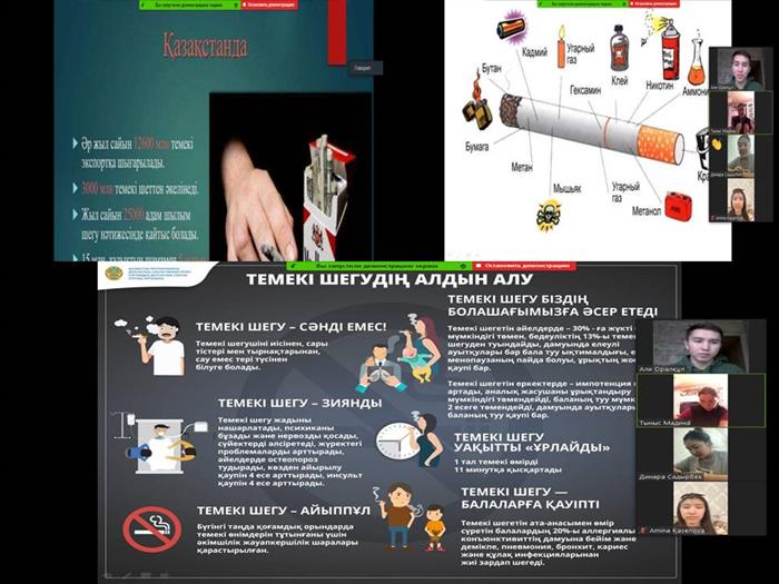 03.02.2021 жылы әл-Фараби атындағы Қазақ Ұлттық Университеті, Философия және саясаттану факультеті, Дінтану және мәдениеттану кафедрасының аға оқытушысы Д.С. Утебаева, өндірістік тәжірибе жетекшісі Әскенұлы Ельнұр мен дінтану мамандығының 4 курс студенті Оралқұл Әли Саинұлының ұйымдастыруымен «Салауатты өмір салты» жобасы аясында «ҚазҰУ – темекіден таза аймақ» атты іс-шара өткізді. Іс-шараның мақсаты: ҚазҰУ студенттерін салауатты өмір салтын ұстануға шақыру. Темекінің адам организміне алып келетін зиянды жақтарын түсіндіру. Іс-шараның міндеттері: Жастар арасында белең алып келе жатқан зиянды әрекеттердің болуын азайту. Іс-шара барысында темекіден арылу жолдары туралы дискусия жүрді, сонымен қатар, адам денсаулығына қандай зиянды жақтары бар екендігі туралы айтылды.