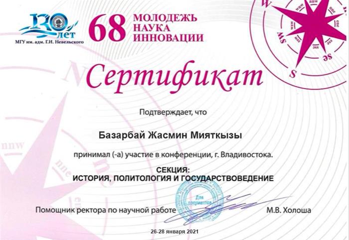 Мәдениеттану мамандығының 4-ші курс студенті Базарбай Жасмин Г.И.Невельского атындағы МГУ ұйымдастырған «Жастар. Ғылым. Инновация» атты Халықаралық онлайн дөңгелек үстелге қатысты