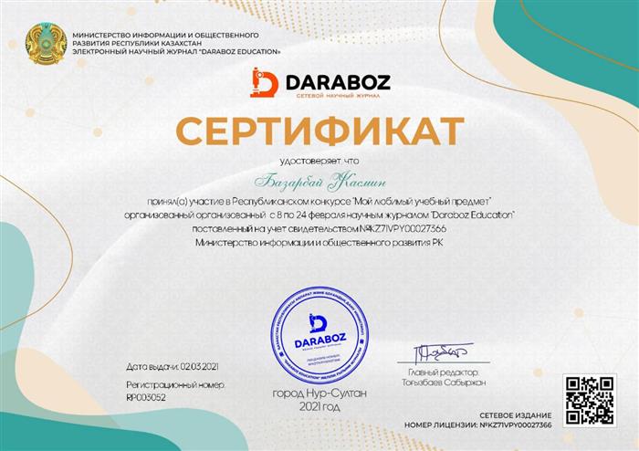 Мәдениеттану мамандығының 4-ші курс студенті Базарбай Жасмин "Daraboz Education" желілік ғылыми журналы Республикалық қашықтықтан өткізілетін интернет байқауына қатысты