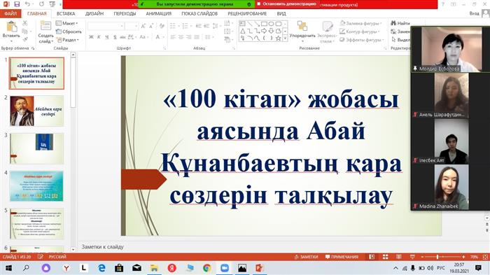 2021жылдың 15наурызында«Мәдениеттану» 2 курс студенттерімен «100 кітап» жобасыаясындаАбай Құнанбаевтың қара сөздерін талқылауонлайн Zoom платформасындатәрбиелік кездесусағаты өткізілді