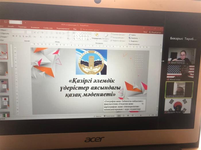 2021 жылдың 17 сәуір күні сағат 14:00–де «Айналаңды нұрландыр» бағдарламасы аясында «География және Табиғатты пайдалану» факультетінің «Геодезия және картография» және «Метеорология» мамандықтарының 1 курс студенттері және «Философия және саясаттану» факультеті, «Дінтану және мәдениеттану» кафедрасының аға оқытушысы Шаңбаева Арайлым Нұрдығұлқызының ұйымдастыруымен «Қазіргі әлемдік үдерістер аясындағы қазақ мәдениеті» атты республикалық деңгейдегі дөңгелек үстелгеөтті. Дөңгелек үстел барысында, студенттер қазіргі әлемдік үдерістер аясындағы қазақ мәдениетінің дамуерекшеліктерін, даму кезеңдерін қарастырып,өз ойларын білдірді. Әр елден делегаттар шақырып, Қазақ елімен, мәдениетімен байланысын анықтады.