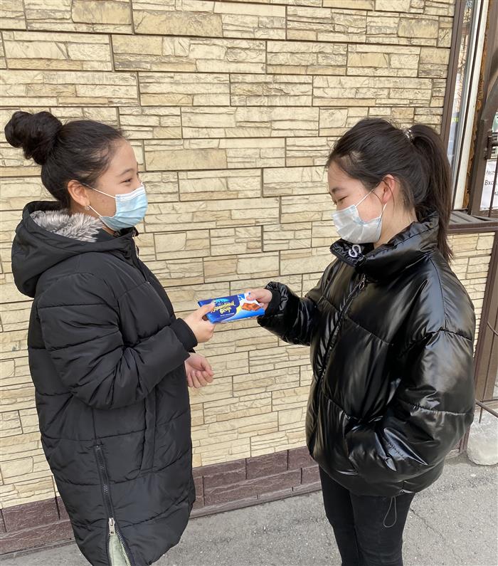 28.02.2021 жылы Философия жәнеСаясаттануфакультеті, ДінтанужәнемәдениеттанукафедрасыныңАғаоқытушысыөндірістік практика жетекшісіӘскенұлыЕлнұр, ағаоқытушысыМұқанНұрзатжәне «Дінтану» мамандығының 4 курс студенті Жұмаш Айгерімнің ұйымдастыруы мен «Айналаңды нұрландыр» жобасы аясында іс-шара өткізілді. Осы іс-шара барысында Талдықорған қаласы, Қабанбай батыр мен Шевченко көшесі қиылысында адамдарға тәттілер таратылды.