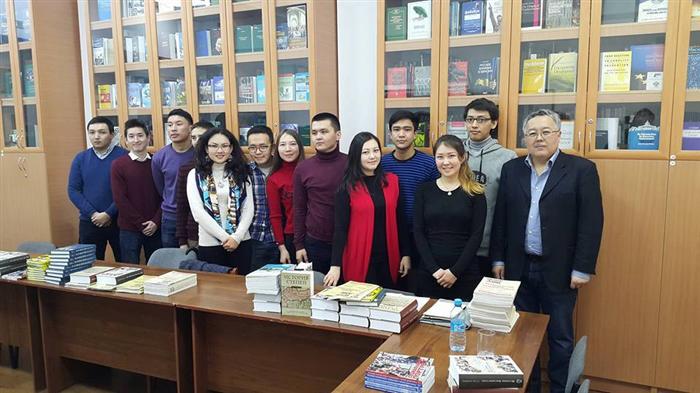 АҚШ генералды консулы Марк Муди және АҚШ елшілігіндегі "Саясат" бөлімінің басшысы Фриман Жу, сондай-ақ АҚШ консулдығының "Саясат және экономика" бөлімінің қызметкері Тимоти Оконнер, ҚазҰУ бірінші проректоры Мұхамбетқали Бүркітбаев, философия және саясаттану факультеті деканы Алия Масалимова, саясаттану және саяси технологиялар кафедрасында қонақта болды. Белгілі саясаттанушы Досым Сатпаевтың ұйымдастыруымен өткен кездесуде АҚШ елшілігі Т.Мұстафин атындағы кітапханаға 150 астам кітаптарды сыйға тартты. Кездесу барысында саясаттанушы студенттер сұрақтар қойып, өздерін қызықтыратын тақырыптарды қозғады. |