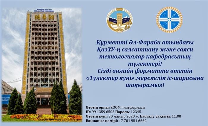 Мамыр айының 30-шы жұлдызында сағат 11.00-де Әл-Фараби атындағы ҚазҰУ, Философия және саясаттану факультеті, Саясаттану және саяси технологиялар кафедрасы «ҚазҰУ Түлектерінің күніне» арналған онлайн кездесу өткізеді. Өтетін орны: Zoomплатформасы Конференция идентификаторы: 991 359 6505 Пароль: 12345