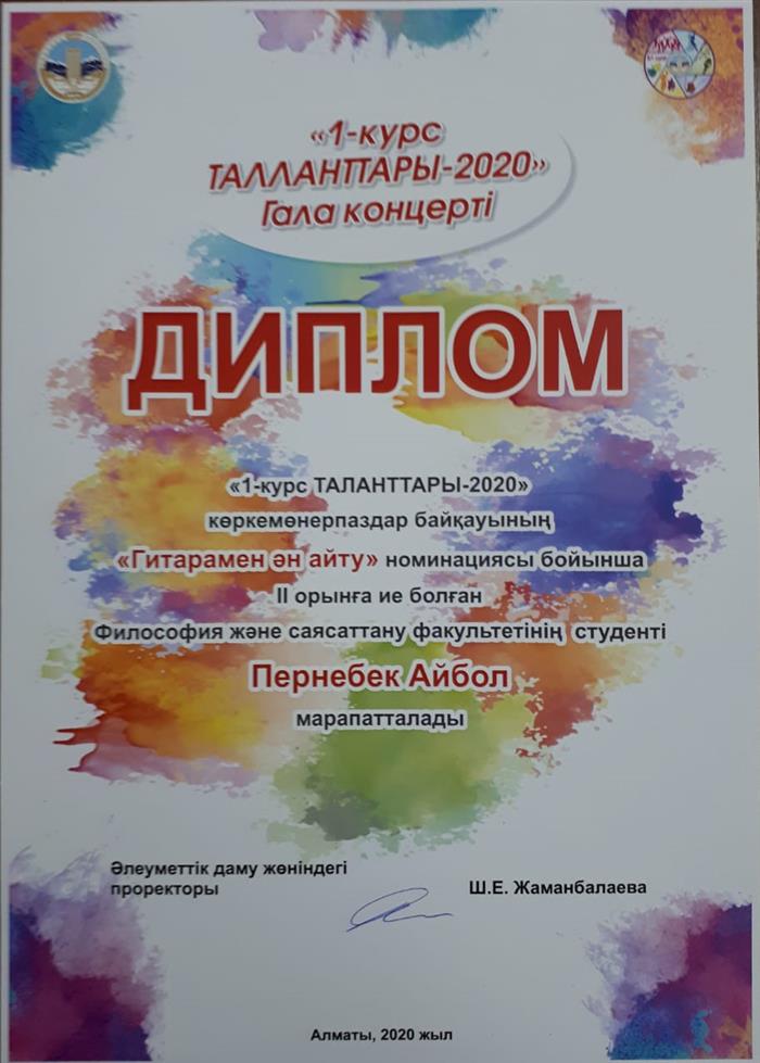 1 курс таланттары - 2020 жыл сайынғы байқауында саясаттану және саяси технологиялар кафедрасының 1 курс студенттері гитарамен ән айту номинациясында Копеев Кастер 1 орын және Пернебек Айбол 2 орын иеленді!