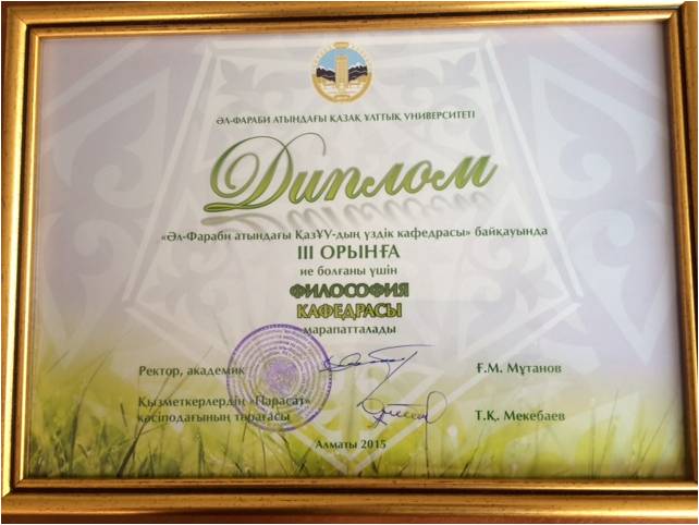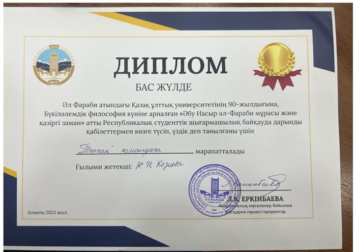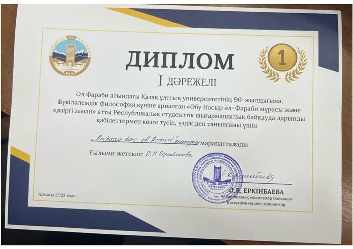 «Әбу Насыр әл-Фараби мұрасы және қазіргі заман» атты Республикалық студенттік шығармашылық конкурс. I дәрежелі диплом.