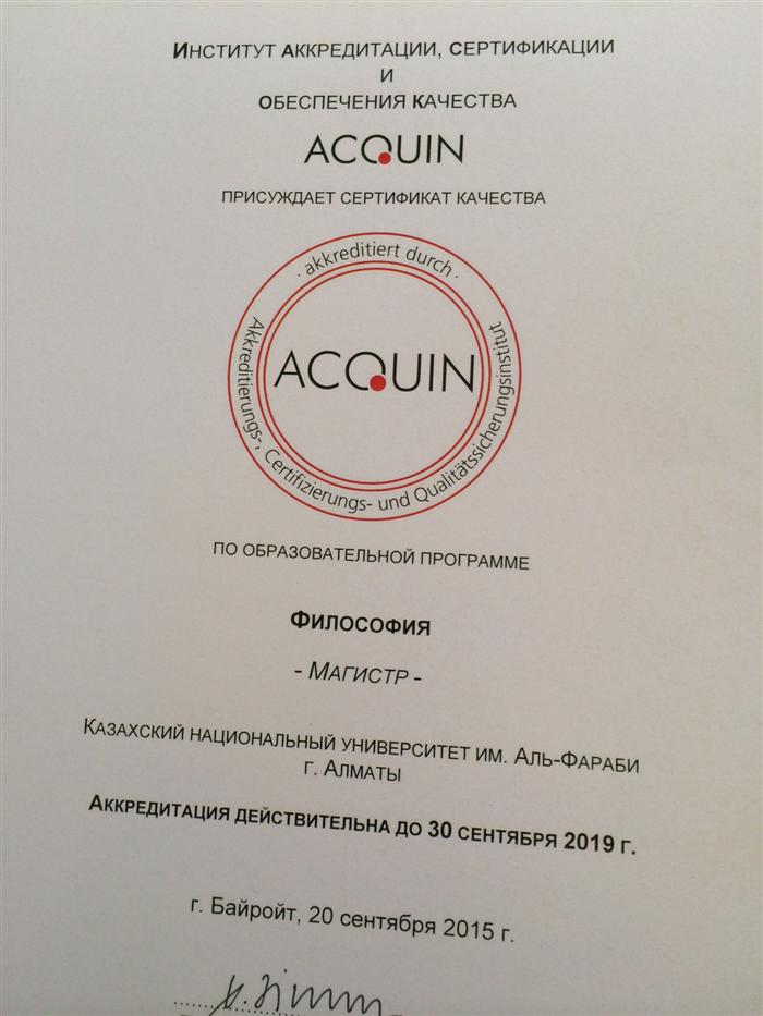4 наурыз, 2016 ж. Философия кафедрасы "Философия" мамандығы бойынша магистрлік білім беру бағдарламаларын аккредитациялаудан табысты өтіп, Германияның Байройт қаласының аккредитация және сапа Институтының сертификатына (2019 жылдың 30 қыркүйегіне дейін) ие болды. |