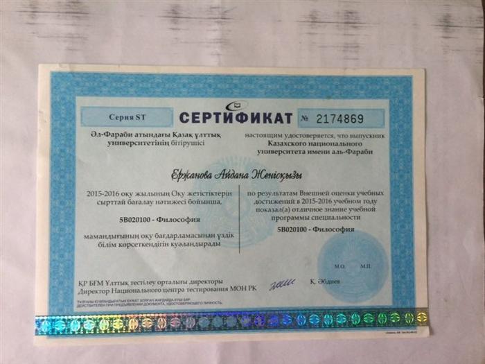 2016 жылдың 4 наурызында "Философия" мамандығының 4 курс студенті Ержанова Айдана Оқу жетістіктерін сырттан бағалау нәтижесі бойынша 5В020100 Философия мамандығының оқу бағдарламасынан үздік білім көрсеткендігін куәландыратын ҚР Білім және Ғылым Министрлігінің сертификатымен марапатталды |