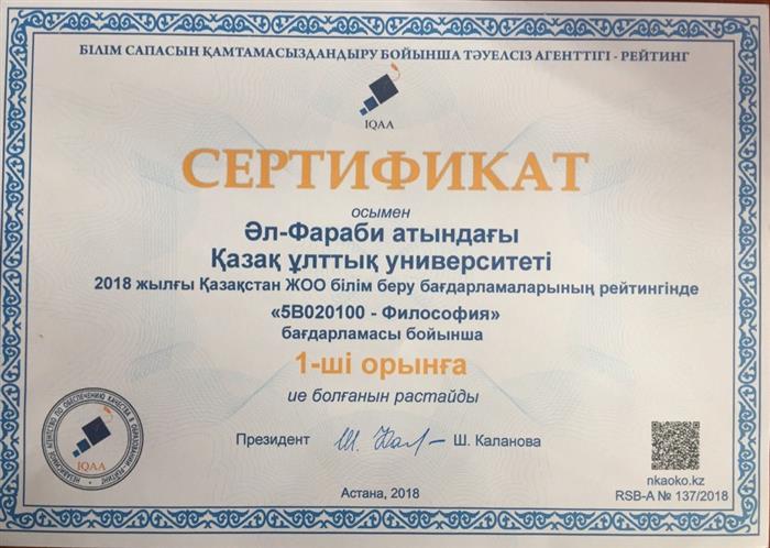 2018 жылдың қыркүйегі. ҚР білім сапасын қамтамасыздандыру бойынша тәуелсіз агенттігі (NKAOKO) 2018 жылғы Қазақстан ЖОО білім беру бағдарламаларының рейтингінде әл-Фараби атындағы Қазақ Ұлттық университетінің "5В020100- Философия" бағдарламасына 1-орын берді! |