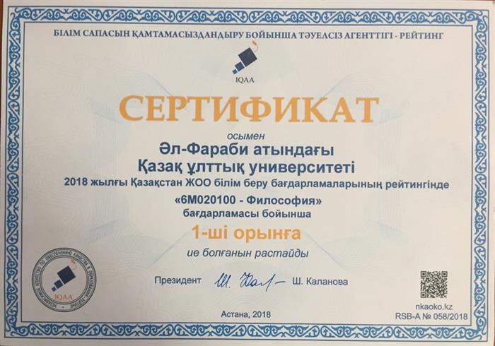 2018 жылдың қыркүйегі. ҚР білім сапасын қамтамасыздандыру бойынша тәуелсіз агенттігі (NKAOKO) 2018 жылғы Қазақстан ЖОО білім беру бағдарламаларының рейтингінде әл-Фараби атындағы Қазақ Ұлттық университетінің "6М020100- Философия" бағдарламасына 1-орын берді! |
