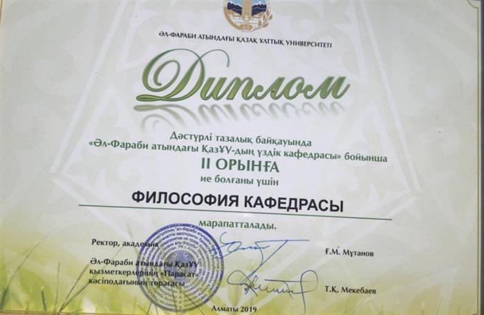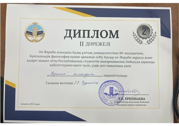 «Әбу Насыр әл-Фараби мұрасы және қазіргі заман» атты Республикалық студенттік шығармашылық конкурс. II дәрежелі диплом.