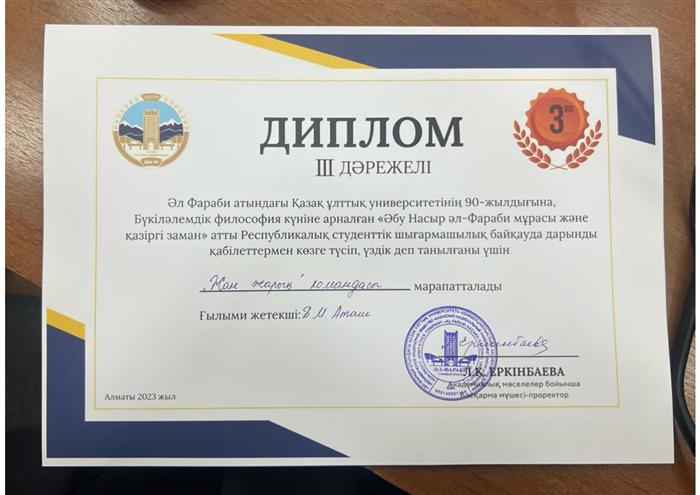 «Әбу Насыр әл-Фараби мұрасы және қазіргі заман» атты Республикалық студенттік шығармашылық конкурс. III дәрежелі диплом