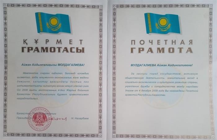Шет тілдер кафедрасында атқарған қажырлы еңбегі үшін А. А. Молдағалиева Қазақстан Республикасының Тұңғыш Президенті Н.Ә.Назарбаевтың Құрмет грамотасымен марапатталды.